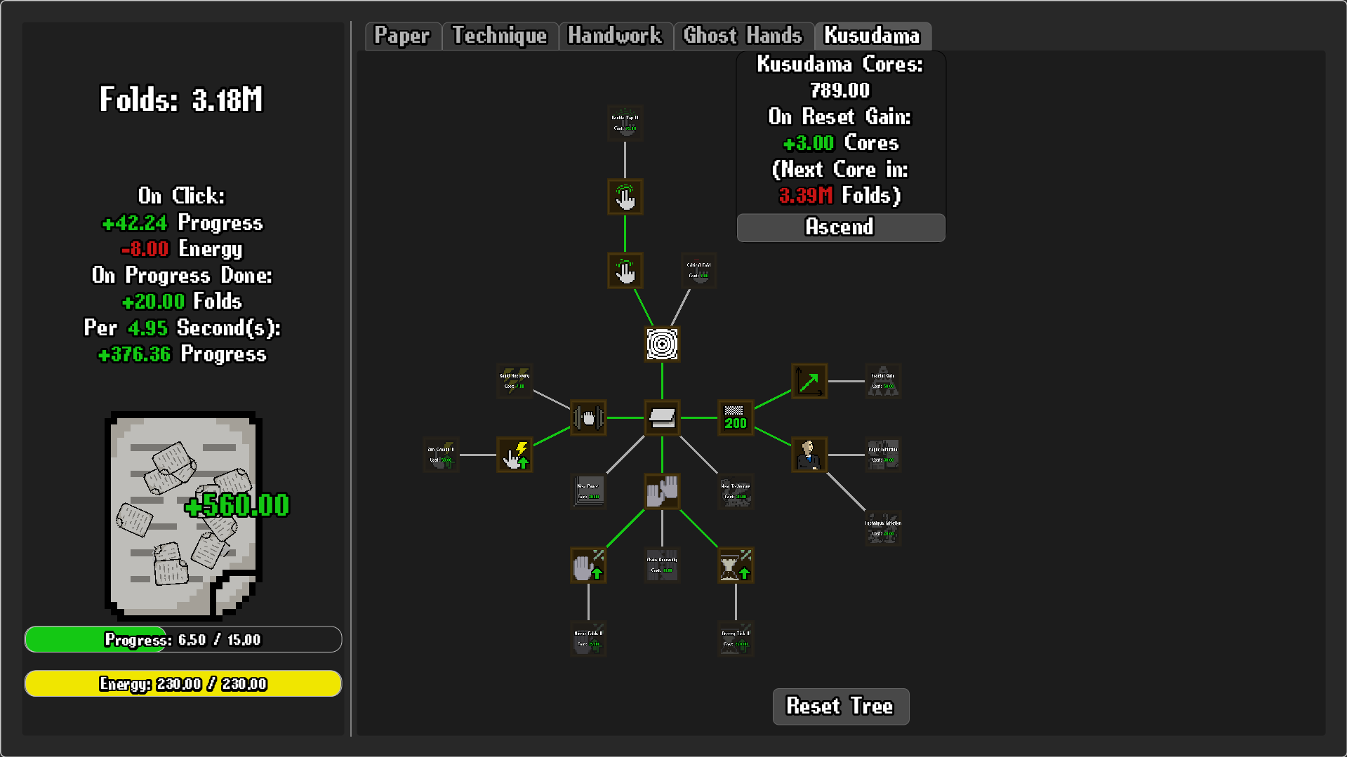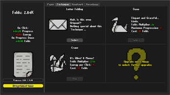 Start with nothing but your trusty Toilet Paper, and work your way up through Newspaper, up to Divine Kami Sheets. Each click fills your Progression Bar, and when it’s full - you gain Folds, the lifeblood of your paper empire.